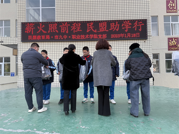1月18日,由民盟新乡市教育局支部、第九中学支部、职业技术学院支部联合开展的“薪火照前程 民盟助学行”2025年捐资助学活动,在新乡市第九中学隆重举行。民盟新乡市委员会专职副主委王海燕出席活动,各支部主委陈峰、刘安桦、吕敏及部分盟员参加活动。