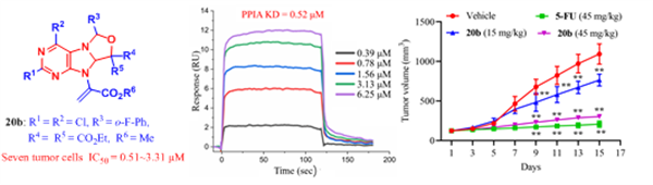 三环嘌呤核苷由于其结构独特性,在药物研发中具有重要的地位。该研究团队设计合成了一系列三环嘌呤核苷类化合物,通过构效关系研究表明,合成的大多数三环嘌呤核苷化合物具有中等到强效的抗肿瘤活性。其中,化合物20b对HCT116细胞表现出显著的抗增殖活性,其体外抗肿瘤细胞增殖活性优于抗肿瘤临床用药顺铂。作用机制研究表明,化合物20b可以明显抑制HCT116细胞的转移和侵袭,将细胞周期阻滞在G0/G1期;化合物20b增加了HCT116细胞中的ROS水平,导致DNA损伤、内质网(ER)应激和线粒体功能障碍,并诱导细胞凋亡,且影响PPIA/MAPK信号通路相关蛋白的表达水平。此外,药物亲和反应靶向稳定实验(DARTS)、细胞热转移实验(CETSA)和小干扰RNA(siRNA)实验结果表明,化合物20b靶向PPIA;小鼠移植瘤实验表明,化合物20b具有良好的体内抗结肠癌活性和较低的毒性。这些结果表明,化合物20b是一类有效的PPIA抑制剂类抗肿瘤化合物,为研发具有自主知识产权的新型核苷类抗肿瘤候选新药奠定基础。